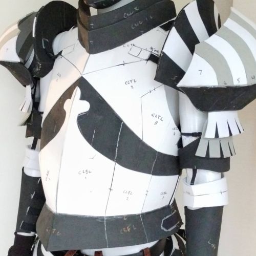 The main cuirass, neck guard, and bottom pieces should be cut out using 4-6mm foam. The pieces labeled "layer" should be cut out using 2mm foam. The layers are aesthetic so if your particular project does not call for that detail, just skip those pieces. Some cuts call for a 60° cut, but it does not have to be precise!